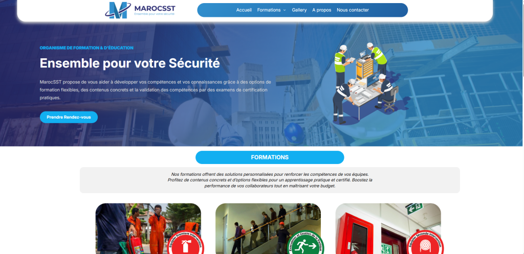 MarocSST propose un large éventail de formations réglementaires essentielles. Ils couvrent l’incendie, l’évacuation et les gestes et postures ergonomiques. Leur méthodologie reste classique mais parfaitement conforme aux exigences légales de base. C’est une option fiable pour les renouvellements de routine et la mise en conformité administrative.